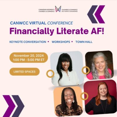 Nous sommes ravis d’annoncer la tenue de notre première conférence financière en ligne, Financially Literate AF ! qui aura lieu le 20 novembre de 13 h à 17 h (heure de l’Est). Cet événement rempli d’action offrira aux participants des ateliers pratiques conçus pour améliorer leur savoir-faire financier et leur donner des outils pratiques pour gérer leur entreprise en toute confiance. Cet événement gratuit est ouvert à tous les membres de la communauté CanWCC, et tout le monde est invité à y participer, alors n’hésitez pas à partager ce lien(https://links.canwcc.ca/3YcnYey) avec toute personne susceptible d’être intéressée.