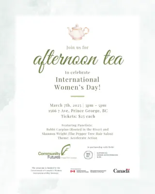 Join us as we partner with Community Futures for an Afternoon Tea to celebrate International Women’s Day! This event will take place on Friday, March 7th from 3pm to 5pm, and will feature a panel of local women entrepreneurs, Bobbi Carpino (Rooted in the River) and Shannon Wright (The Pepper Tree Hair Salon). Theme: Accelerate Action.