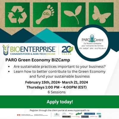 If sustainable practices are important to your business, or you want to learn more about incorporating sustainability and the ‘Green Economy’ into your business, PARO Centre for Women’s Enterprise is running a FREE 6-week online program on this topic. Open to all cross-Canada women entrepreneurs looking to better understand the Green Economy, and how to incorporate greening your operations and business no matter what sector, services, or products you provide.
