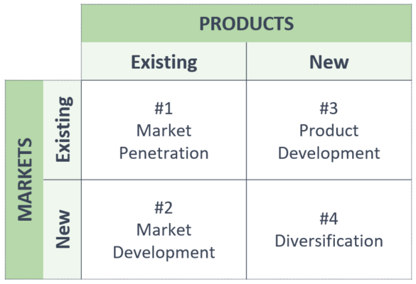 So your strategy might be based on expanding existing products and existing markets (#1 – market penetration), existing products and new markets (#2 – market development), new products and existing markets (#3 – product development), or new markets and new products (#4 – diversification).