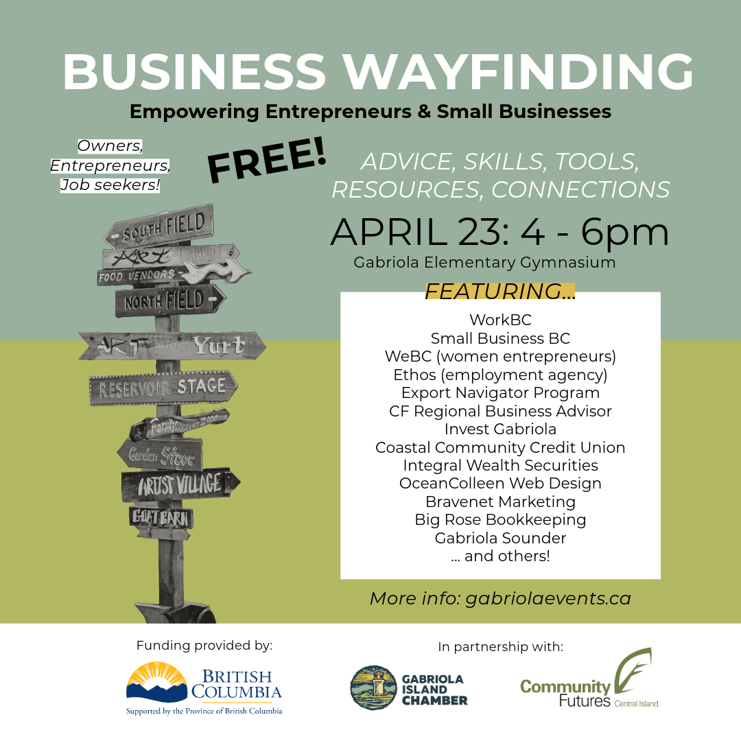 Join us in partnership with Community Futures Central Vancouver Island on April 23 for "Business Wayfinding"! This free event offers advice, skill-building, resources, and connections for job seekers, business owners, island entrepreneurs, and organization leaders. Our Business Advisor, Kelly Masson, will join other local experts and community partners from 4 pm to 6 pm at […]