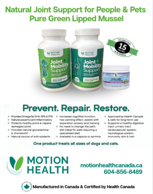 Whether you have four legs or two, Motion Health Canada provides pure, all-natural supplements made from Green Lipped Mussel, a nutritional powerhouse for optimal joint health, cognitive function, improved heart and gut health and anti-inflammatory benefits. Proudly founded and run by Canadian women for over 15 years.